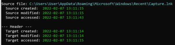 ‘Snip & Sketch’ is its own application, and it also has a shortcut key (Win+Shift+S). Interestingly, taking a screenshot with the shortcut key results in a notification being displayed in the bottom right but no automatically created LNK files. If the user was to click on the notification that is displayed, then the picture will open in ‘Snip & Sketch’, which generates a LNK file indicating the source is ‘Toast’ (as in notification).