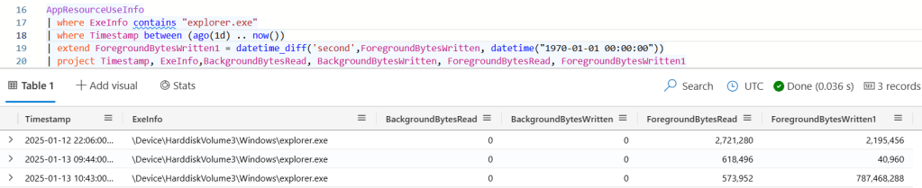 For data copy I grabbed the Explorer.exe process and the AppResourceUseInfo table (I didnt realise the ingest thought one of the fields was a timestamp instead of a long, so had to convert it). Here we can see that there was around 750MB (almost exactly the right number of bytes) written by the Explorer process, which tracks with the activity. Interestingly it doesn’t track the bytes read?
