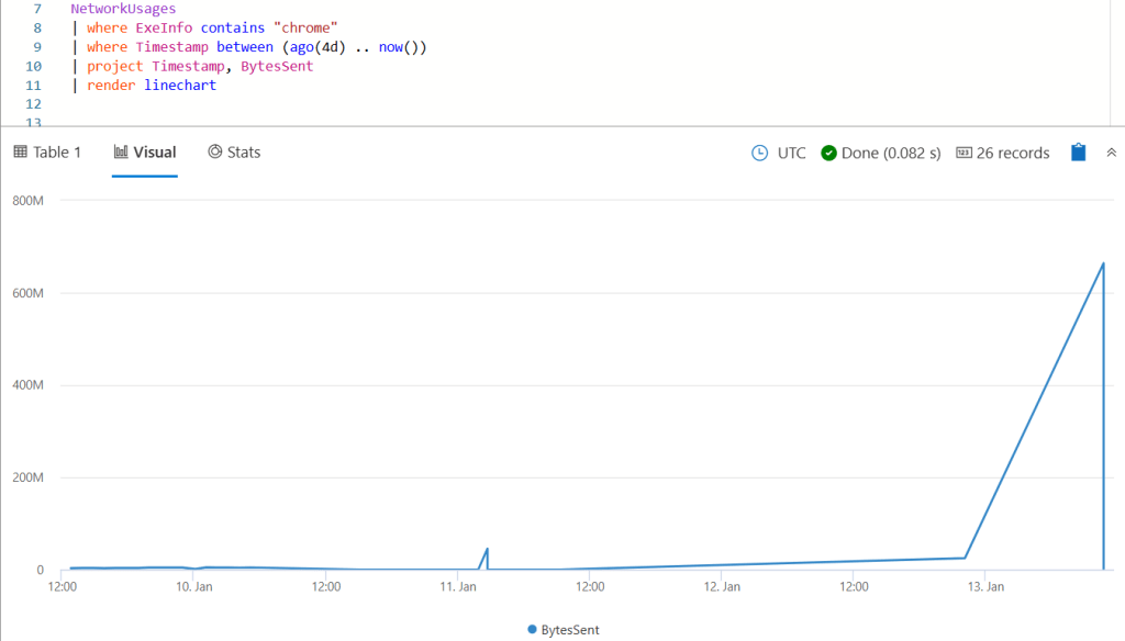 ADX is really great for this type of analysis because of the simplicity of the graphing features. Unfortunately I dont use this computer enough to graph with more granularity but you can see the spike pretty easily when filtering for BytesSent with Chrome.exe. The activity itself was recorded with a timestamp of 2025-01-13T10:43:00Z.