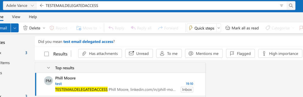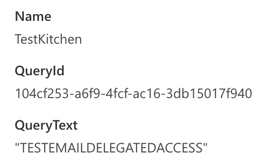 Data generation: I ran a content search through the eDiscovery portal in Purview (around 7:22AM, the screenshot was from the first time I did this the day before so the search name is now different), and then also added delegated access to the users account we can look in Outlook Web Access. I also made sure to send an email with specific wording to search for “TESTEMAILDELEGATEDACCESS”.
