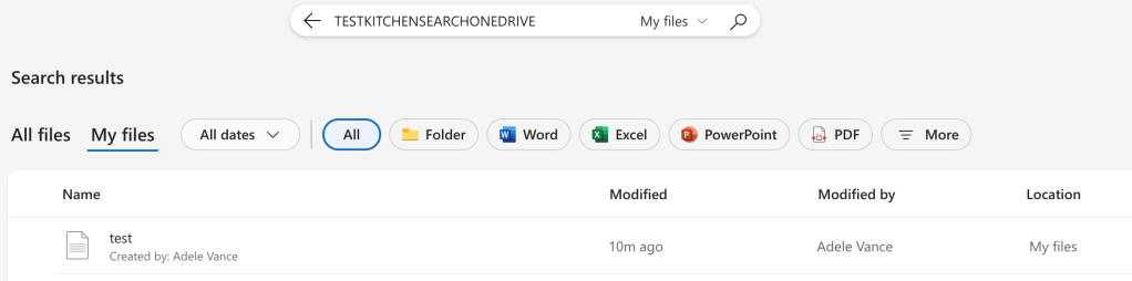 There was this interesting link though since it couldn’t find it but clicking on that didnt find anything. It seems that it searched across Sharepoint and the hits in this tenancy would only be in OneDrive.