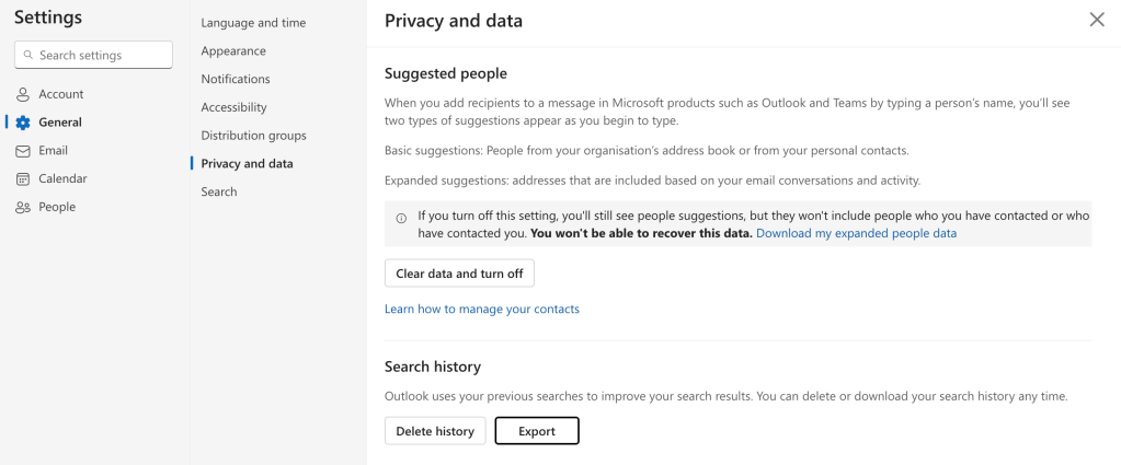 Something else that was interesting; if you go into the users settings (per account – I cant see a way to do this elsewhere or against a delegated mailbox), you can export the user searches