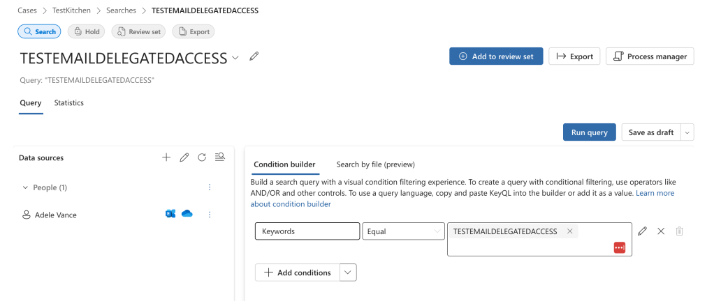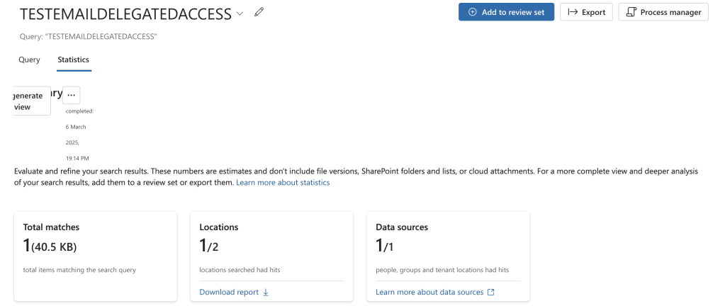 Data generation: I didnt bother running a content search through the eDiscovery portal in Purview again because it should be logged the same way as the email search. , and then also added delegated access through the Admin portal.