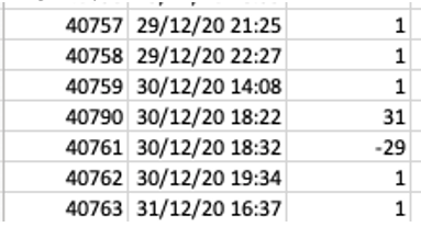If we sort by date rather than UID, which I did in Excel, it stands out quite a bit. The right hand column is just showing the difference between the UID and the previous UID. I would expect them to by 1 except for the answer, except I did see some other (much lower) numbers in there.