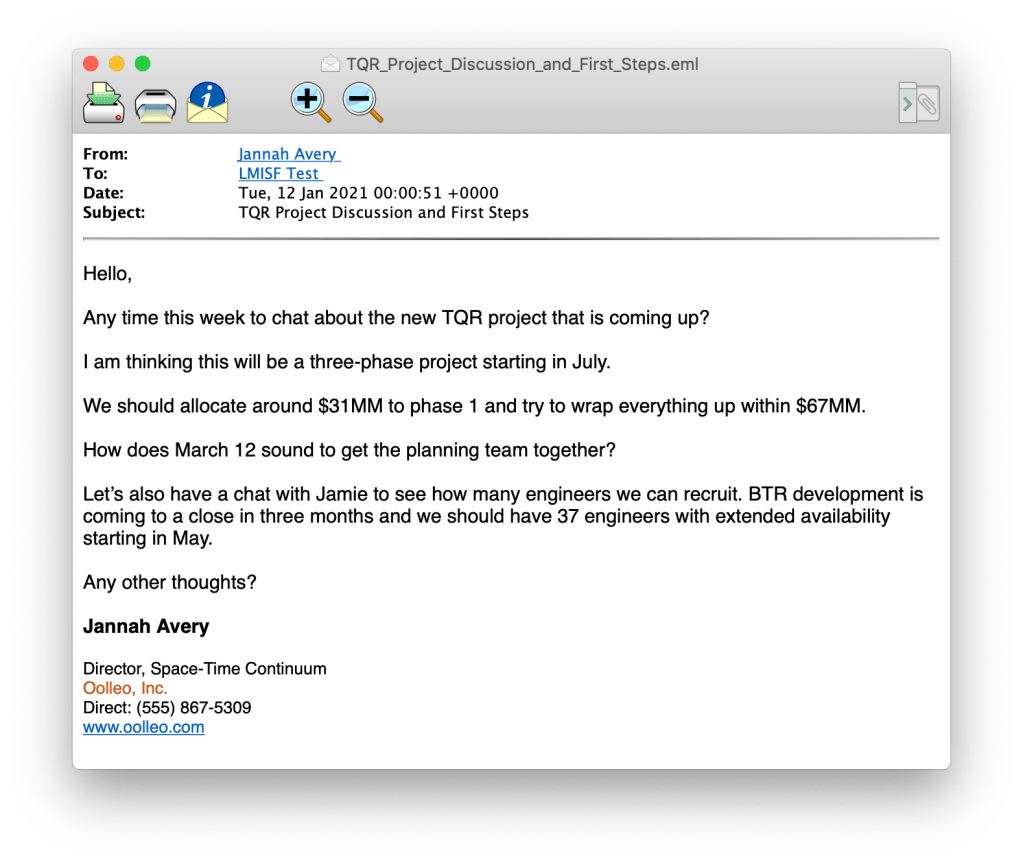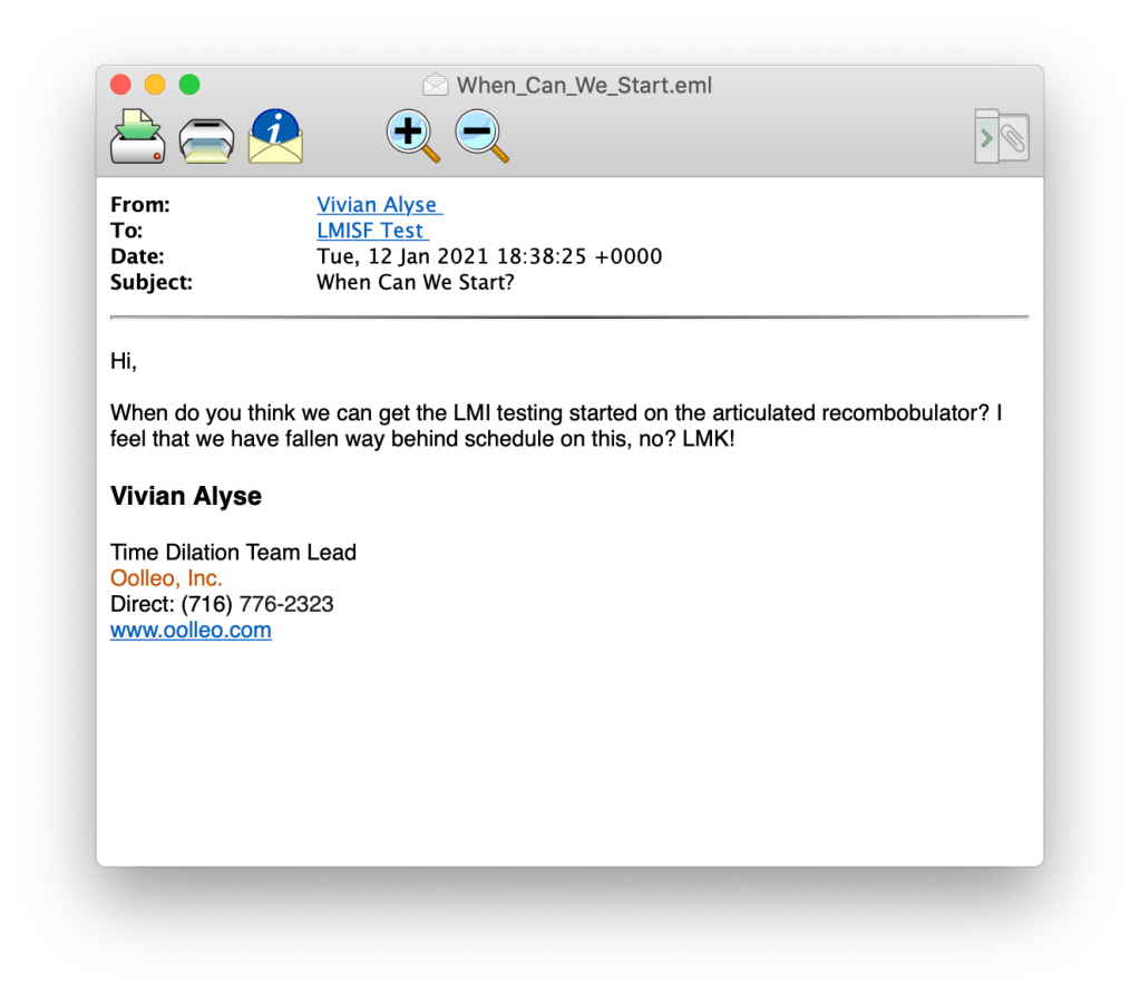 Initial observations show that this email is an email sent from Vivian to LMISF Test at Tue, 12 Jan 2021 18:38:25 +0000. There are no attachments. Not unexpectedly the email is presented in HTML.
