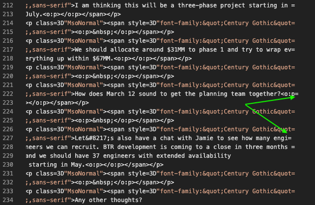 In the image below I’ve highlighted both of the lines that are deemed to have been manipulated as a minimum (excluding the changed word). As you can see, it’s not a straight line of = signs. The part that slighly threw me here is that I didn’t think that it’s a requirement for it to finish in an equal sign, but then if the mail application is cutting off a word it probably would put the = in there to wrap around. We can see on line 229 for example that the line ends well short, and has no reason to add an = at the end.