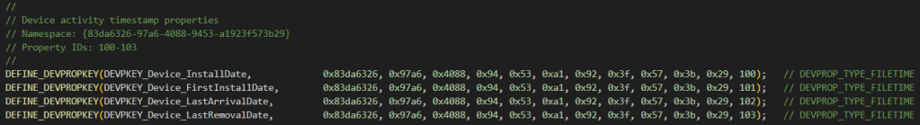 There’s a file called devpkey.h which is referenced in the Microsoft Learn documentation related to driver installation where you can find the rules around FirstInstallDate, and InstallDate (but I couldn’t find more documentation on the other two). After a little bit of Googling I found the file online in some GISTs and GitHub repo’s (related to WINE), but then realised that I could actually find it in the Window SDK.