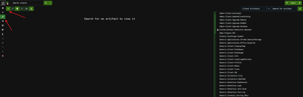 velociraptor guiin an Admin prompt. This makes your machine both the server and the client so it’s super easy for testing. - Next load up the below artifact; select the wrench to view artifacts and click the + to add a new artifact, then copy the below artifact in and hit save.